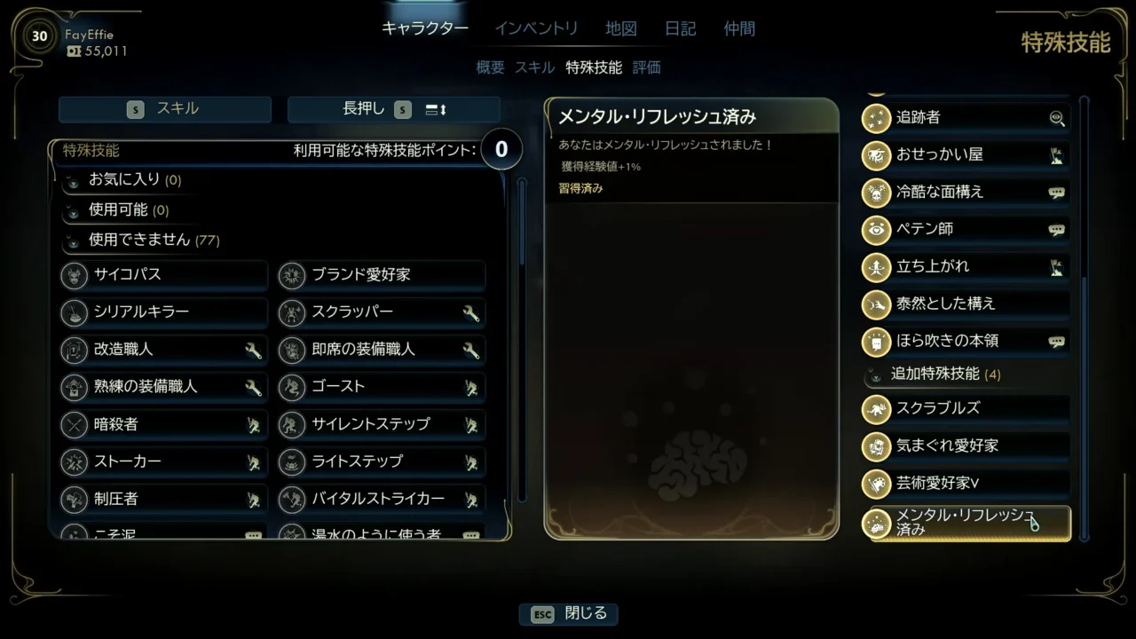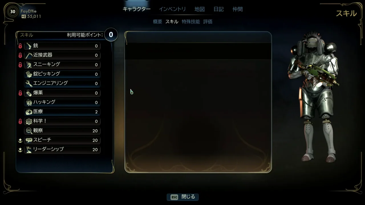 最終的にスキルは「リーダーシップ」「スピーチ」「観察」を20(最大値)にした(おまけで医療2)のですが、その上で取得した特殊技能を紹介してみます。