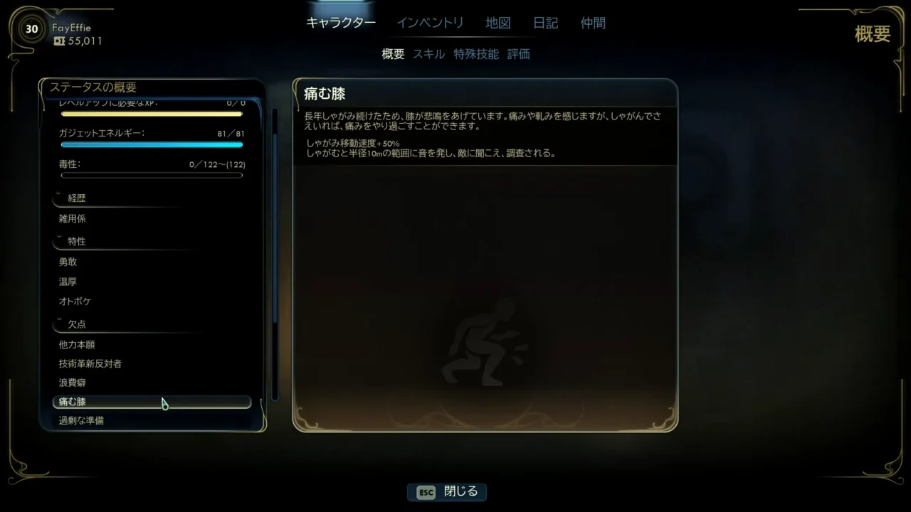 まずデメリットがあまり感じないのが「膝が悪い」。しゃがみ移動速度+50%になる代わりに、しゃがんだり立った瞬間に関節が鳴り、近くのNPCに聞かれると検知されてしまうもの。
