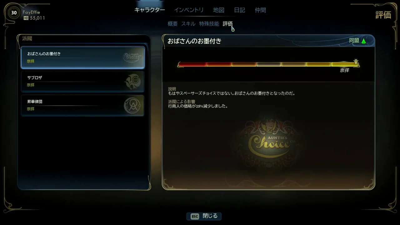 • 企業間協力(昇華律団とおばさんのお墨付きの派閥クエストをすべて完了した)