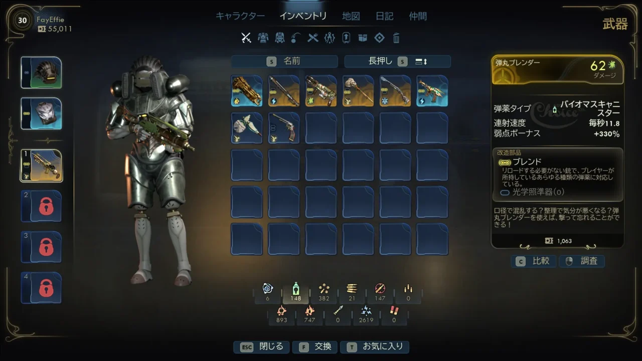 「視野狭窄」は武器スロットが1になってしまうかわりに、防具貫通+25%の恩恵をもらえる。インベントリ開いて武器変えるのは問題なく出来るので、それが面倒と感じなきゃメリットしかない。あと例の弾種問わない銃もってしまうか。